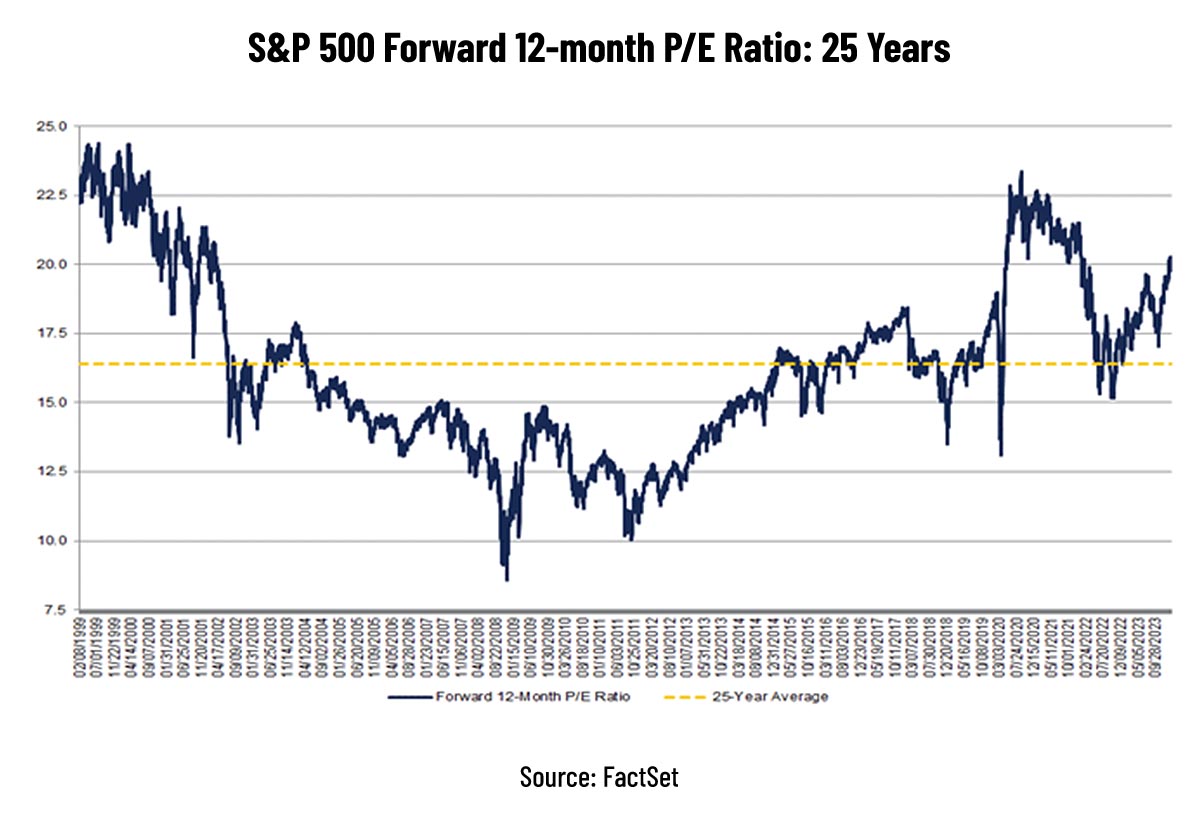 When looking at price-to-earnings (P/E) multiples over time, it seems that stocks can go through periods of extremely high (and low) valuations, but they are never sustained. As seen in the chart below, the 25-year average P/E ratio for the S&P 500 is 16.4, and even though the market has fluctuated above and below this average, valuations always revert back toward this average.